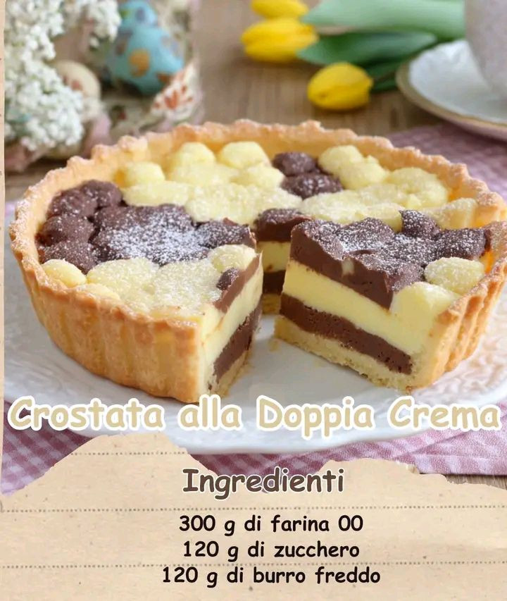 La crostata alla doppia crema è un dolce spettacolare che conquista al primo sguardo e al primo assaggio. La sua particolarità è l’abbinamento di due creme diverse – di solito una classica crema pasticcera e una crema al cioccolato – che si uniscono in un guscio di pasta frolla friabile, creando un contrasto scenografico e irresistibile. Perfetta da servire come dessert della domenica o nelle occasioni speciali.
